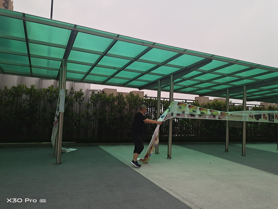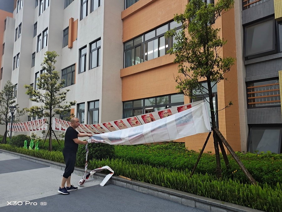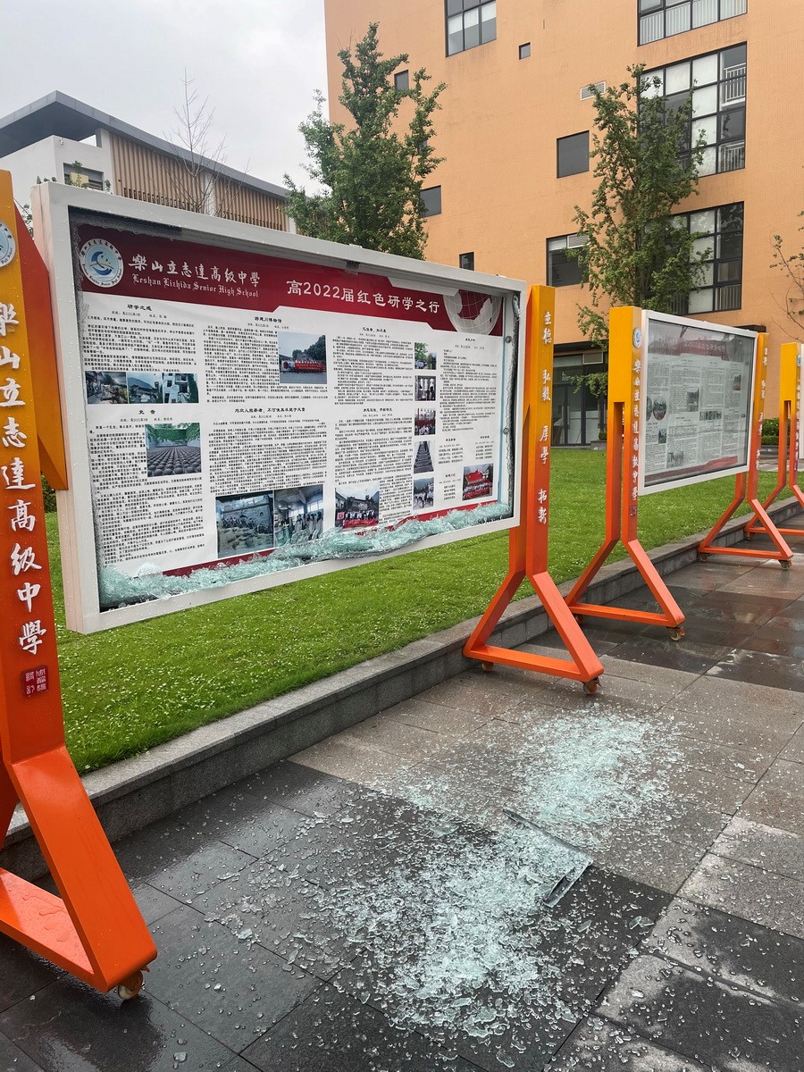 乐山外国语学校滟澜洲校区(乐山立志达高级中学)学生们平静的课堂自习被风雨吹乱,校园内厚重的宣传栏、架空层的宣传画、党史宣传长廊、餐饮部粗加工雨棚在风雨中饱受摧残!