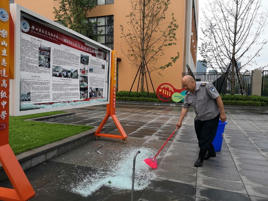 面对暴雨突袭,学校第一时间启动应急预案,在执行校长谢鹰、副校长张丰的指挥下,后勤部门率先展开安全隐患排查、现场清理工作。保卫处出动全体人员紧急巡逻,维护校园秩序,确保学生安全。