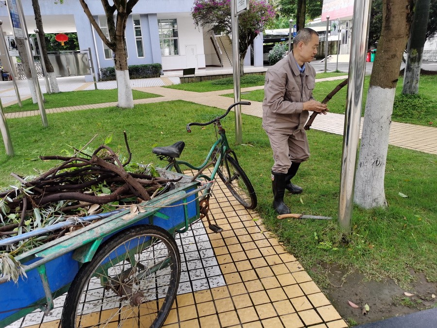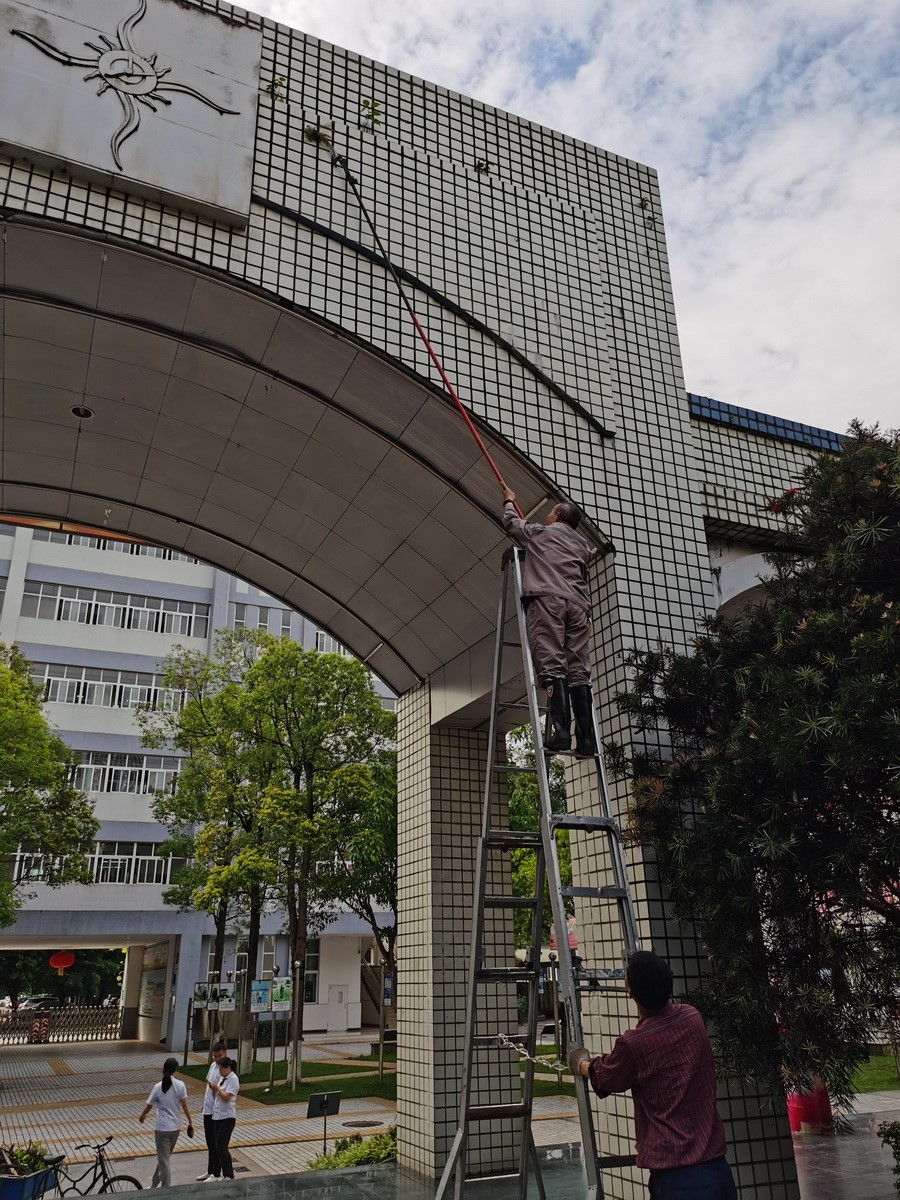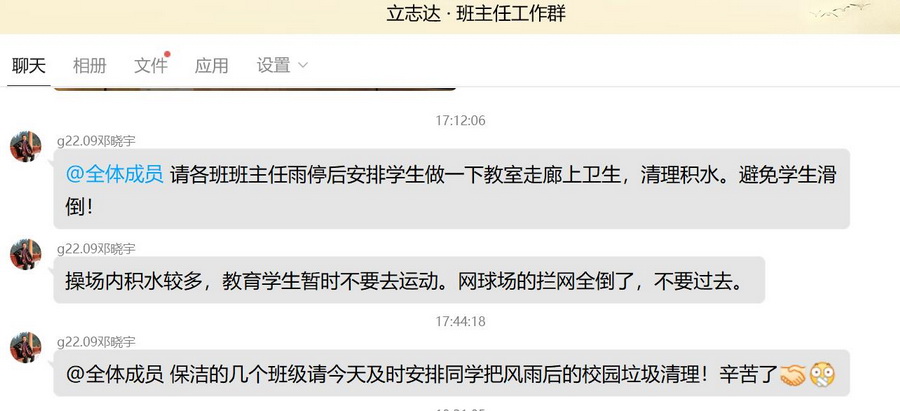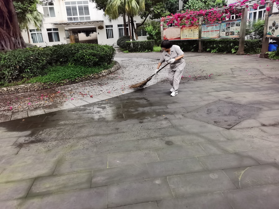 同一时间,肖坝校区的后勤人员也在执行校长田华伦、后勤部长陈先斌的安排部署下紧急行动起来,及时发布预警通知,巡查教室、校舍,对低洼地带的积水点进行疏通排渍,雨后及时进行校园公区和路面清理,保障师生出行不受影响。