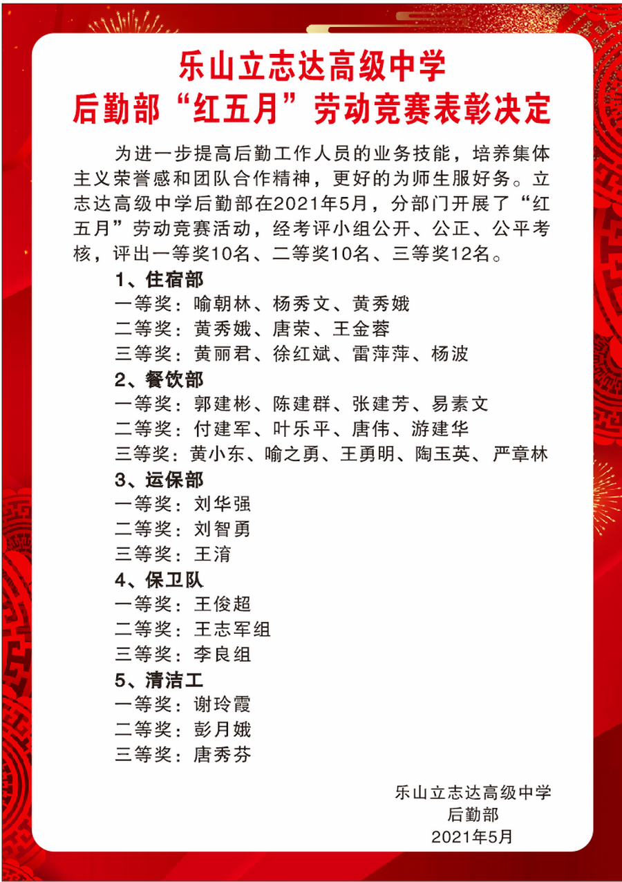 为进一步提升后勤服务品质,激发广大员工学习热情,提高技能专业化水平,2021年5月20日—27日,四川立事达教育集团旗下的乐山立志达高级中学(乐山外国语学校高中部)后勤部按照“促进业务管理,提综合技能”原则,由部长季颜青组织各单位开展了“红五月”劳动竞技活动。