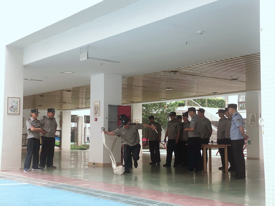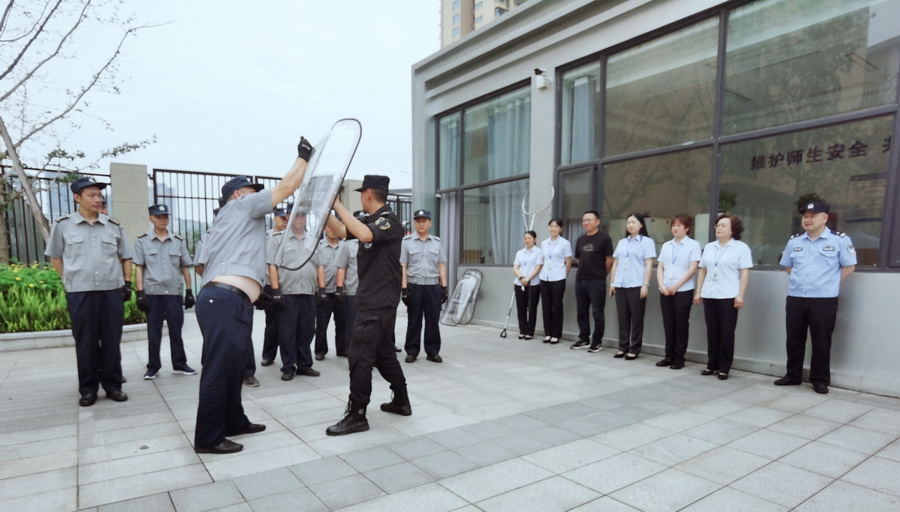 5月27日,保卫部开展了保卫技能比赛,比赛项目包含学生进出学校管理要求、来访人员接待流程、学生进校安检过程、校园巡查和清场、紧急事件、防暴盾牌的使用、消防栓的使用7大方面。