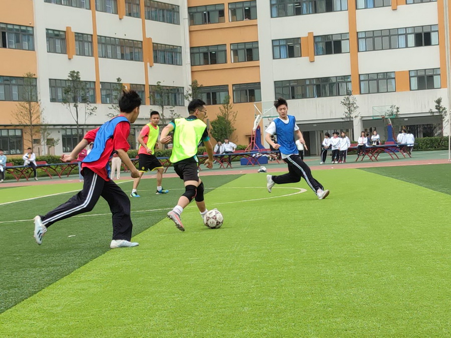 仪式后,教师代表队与学生代表队进行了一场令人热血沸腾的友谊赛。比赛由谢鹰校长开球,双方队员展开了激烈的对抗,马立新副校长一记精彩的“巴蒂GOAL”,赢得现场观众一阵欢呼,娴熟的脚法、快速的截断、势均力敌的对抗,双方你来我往,激战酣畅,一个个精彩的进球,伴随着台下观众呐喊助威,把比赛不断推向高潮。