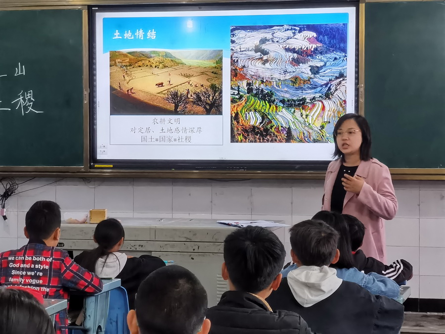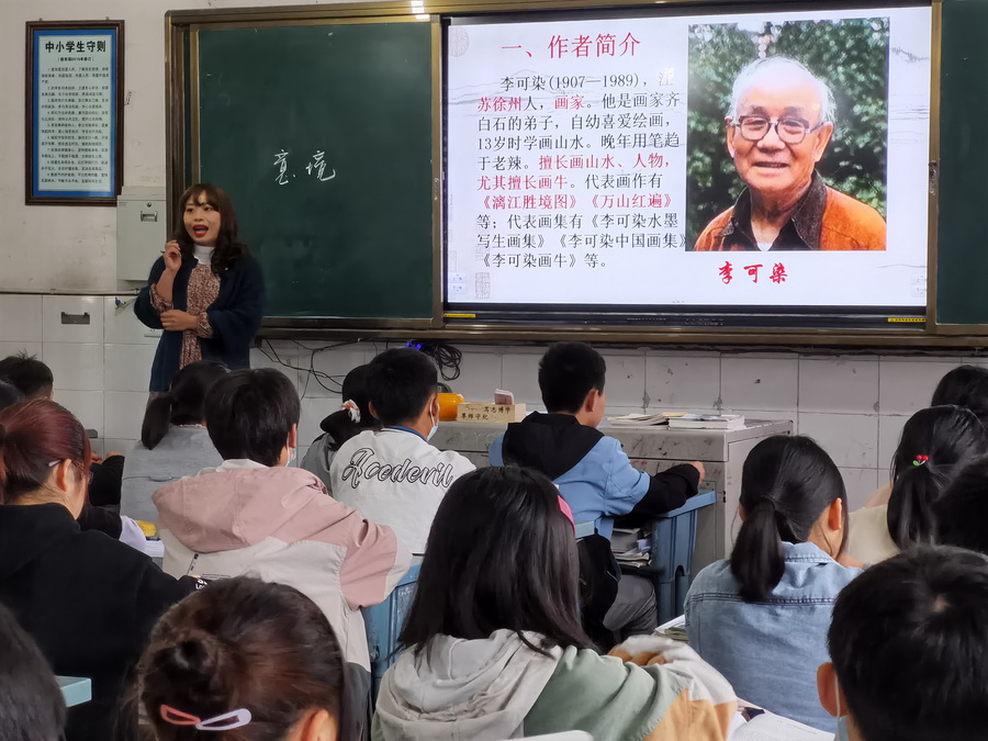 从教以来一直在高中任教语文,支教前一个星期听闻此次需要到双福中学初一2班上《土地的誓言》一课,心里不免忐忑。不同学段的学生思维方式和语文课标要求存在较大差异,如何在40分钟内给学生带去新的语文感受、激发他们对文化的兴趣,而不打乱原有教学节奏,是在临行前担心最多的问题。高中语文偏向于逻辑思维培养,初中语文更着重感性体验,教学过程中如何做到一课一得、知识当堂过手,我心里最初是没有谱的。