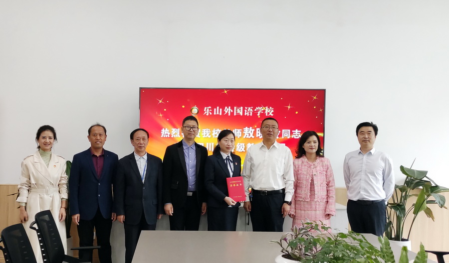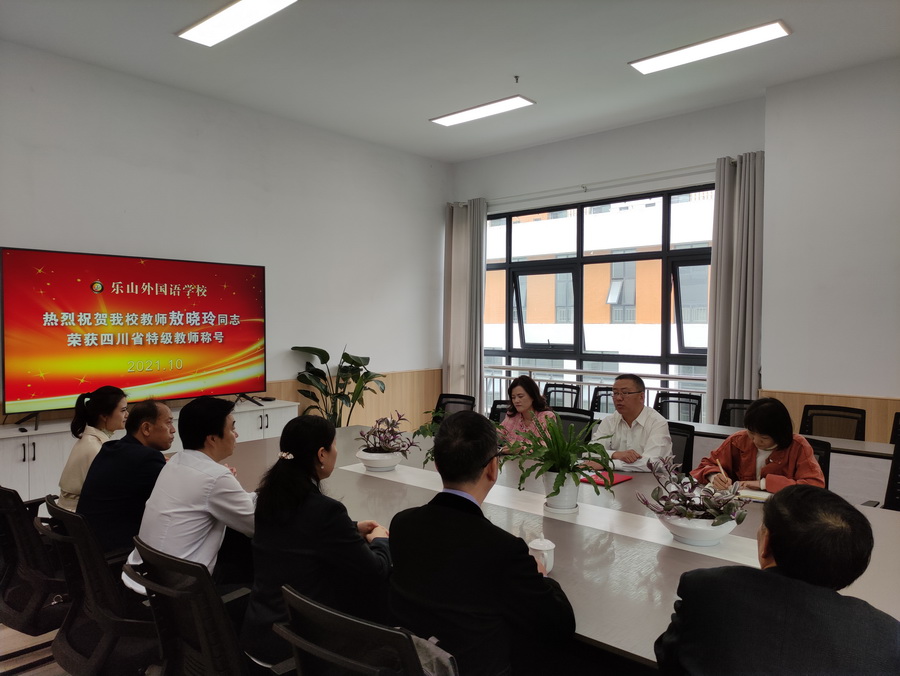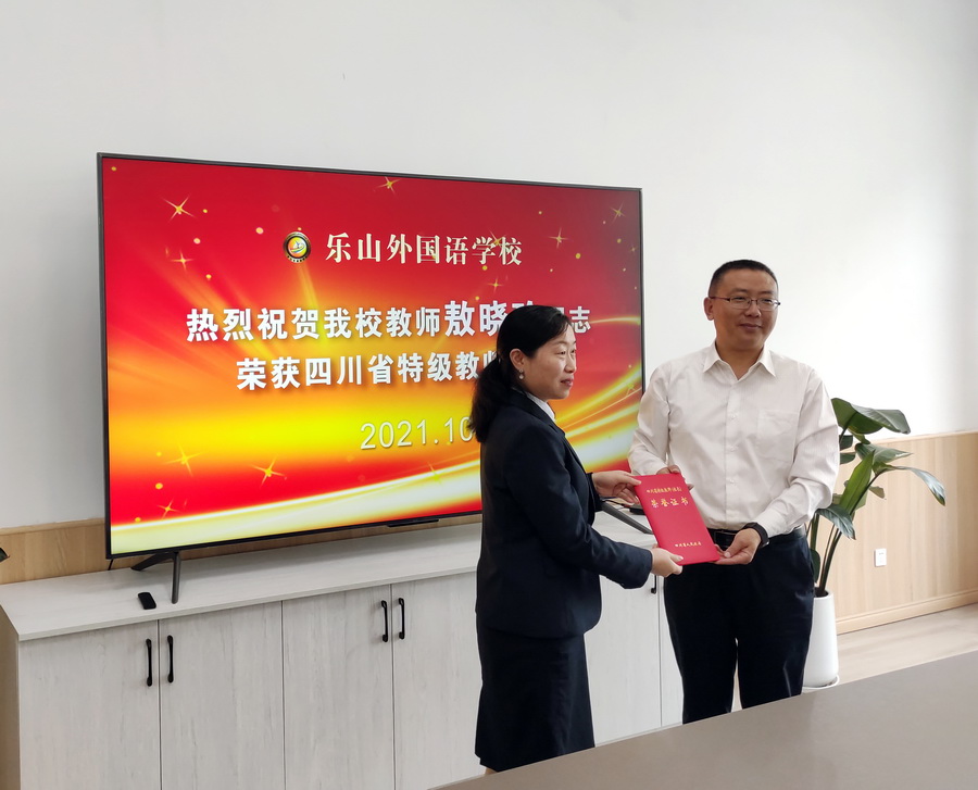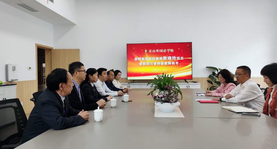 2021月10月14日,乐山市委教育工委副书记刘友军、人事科长郑雪卉带队奔赴我校,为敖晓玲老师颁发了“四川省特级教师”荣誉证书,并对学校党建工作进行了调研指导。