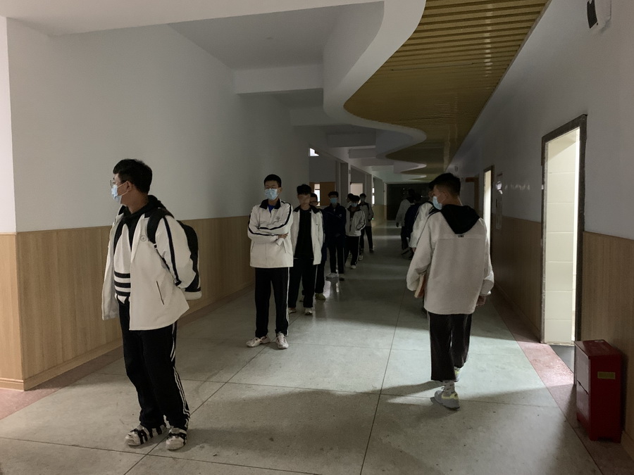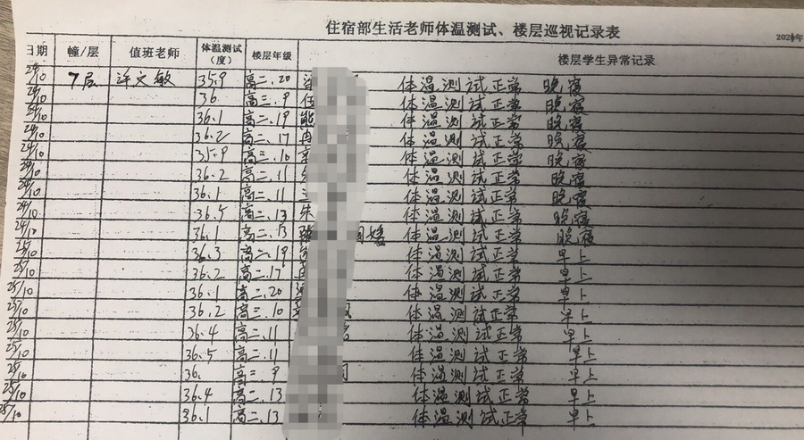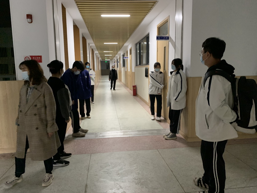 德育部召集各班班主任,完成了学生的信息采集和上报。随后,引导名单上的学生戴上口罩,前往应急隔离教室隔离并时刻监控体温。应急领导小组成员则在现场安抚学生情绪。