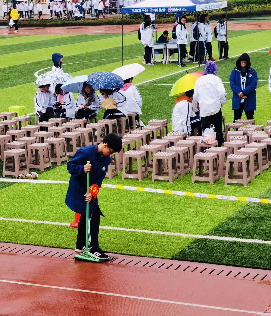 前方的运动员们在赛场上奋力拼搏,后方的无名英雄劳碌在绿茵场上,奔波在跑道之间。胜利中凝聚着他们无尽的汗水,笑容中浸没了他们无数的辛苦。恪尽职守的裁判们,默默无闻的学生会、各班拖地的同学、后勤老师们,是他们的努力,成就了更好的外校运动健儿,是他们的付出,造就了运动会的圆满成功!
