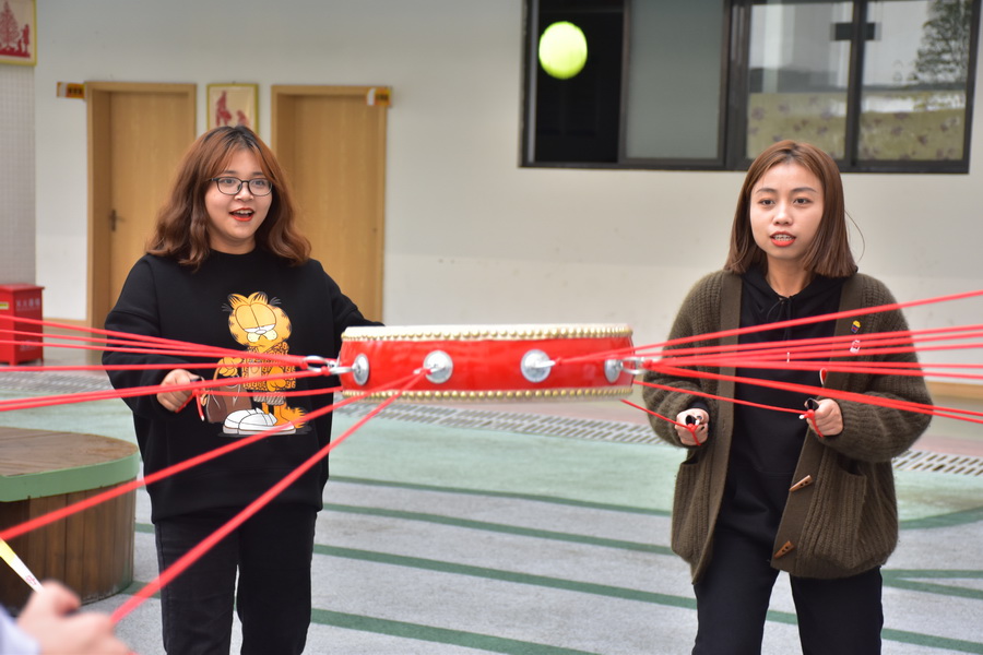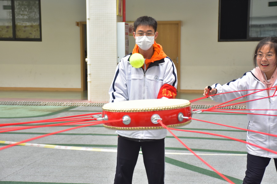 合作是个人与个人、群体与群体之间为达到共同目的,彼此相互配合的一种联合行动方式,学生在合作性游戏中调整自己、观察别人、互帮互助、达成目的。“巧接弹珠”需要两个人的配合;“纵横天下”需要2人、4人、6人或8人的配合,人数越多,难度越大,每一个人在活动中都是主角,他们在用行动和力量掌控着“球”的走向;“击鼓颠球”需要10人配合,从颠一个球到颠9个球,团队的默契及共同的支持在合作行动中慢慢形成,失败后的再来,成功后的喜悦,让10人小组获得内心力量。
