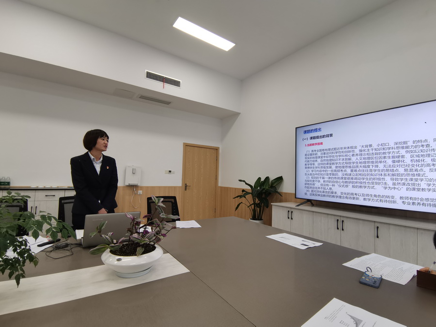 课题负责人陈洪莉围绕课题研究作中期成果报告。从课题的提出,研究的价值、意义、创新点,达成的研究目标与内容,本研究的思路与方法,研究取得的主要研究成果、研究产生的效果,研究不足之处与后期主要研究方向七个方向展开汇报。重点讲述了课题组初步凝练出高中地理微专题课堂“五环八步”教学模式,并进行扎实的微专题教学实践,形成相应的教学材料,为地理学科核心素养在课堂教学中落地提供可借鉴的典型案例。指出课题组成员每学期至少公开展示两节微专题研究课,全体课题组成员进行观摩,听课、评课,总结经验。形成高中地理微专题开发、教学、评价一致的《高中地理微专题课程开发与教学效应研究》的理论支撑、策略、方法、方式,构建中学地理微专题课程开发研究的理论体系和操作方法,形成包括微专题主题、案例选取、教学设计、实施策略、效果评价等成果的高中地理微专题课程开发体系。一年来,课题组多篇论文获市级、省级奖项,成员多次在高三地理优化培训会上专题发言和公开课,成员参与新课程开发和教辅资料编写,取得了很好的社会效应,课题组和组内成员取得了多项荣誉,以研促学,教师的专业化成长也得到了提高。最后,陈洪莉老师提出了课题组研究的不足以及研究过程中的一些困惑,希望得到专家的指导。