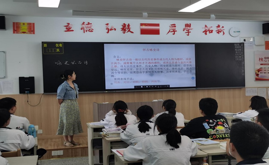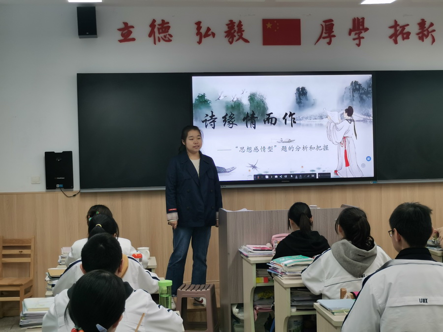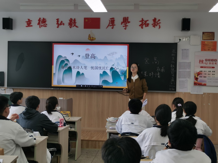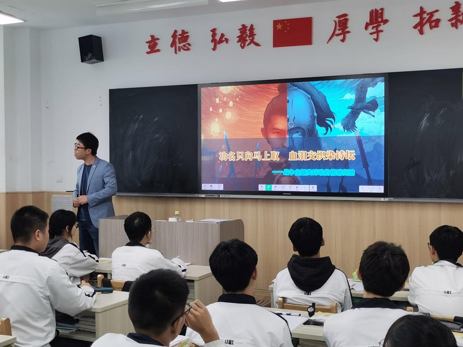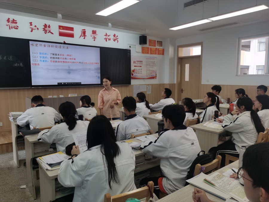 语文课是最美的课堂。诗经论语、楚辞乐府、唐诗宋词、元曲歌赋、小说戏剧,无一不是语文素材,课堂华章。老师们带着孩子们徜徉诗词歌赋的广阔海洋,感知中华文化的博大精深,这是古老与青春的相遇,这是诗性和灵性的交融。高二年级的周佳老师和刘芳老师,同课异构《咏史怀古诗》,周佳老师带领同学全面认识咏史怀古诗,建立鉴赏体系,宏观大气;刘芳老师则引导同学细品杜甫的《咏怀古迹》,读议品悟,细腻动人。颜晓特老师以《功名只向马上取,血泪交织染诗坛——边塞战争诗》为题,老师旁征博引激情肆意,学生跃马关山驰骋诗坛,课堂磅礴厚重酣畅淋漓。