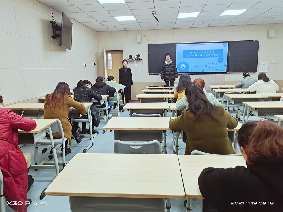 生活老师管理是学校工作的“半壁江山”,宿舍被称为学生的“第一社会,第二家庭,第三课堂”。为进一步提升生活教师岗位技能,强化岗位职责,增强良好的职业道德和敬业精神,同时提高全体生活老师对学校教育理念和教育文化的认识,更好融入学校、融入岗位、融入学生。2021年11月19日,乐山立志达高级中学后勤部在录播教室召开了生活老师培训会并进行当堂测试。会议由住宿部主管李春梅主持,党总支副书记周静婷、后勤部长季颜青发言。