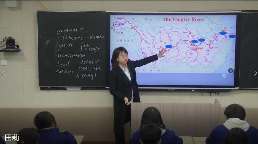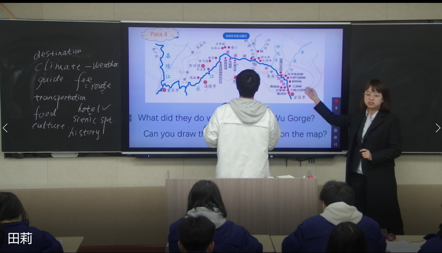 二号赛手,英语组老师田莉与高2023届1班孩子们在课题《B4M5 introduction and reading——A Trip Along the Three Gorges》导引下畅游了长江三峡。利用由浅入深、自然推进lead-in→pre-reading→while-reading→post-reading几个环节,每个环节师生互动、生生互动,在宏大美景中感染家国情怀与中国力量。