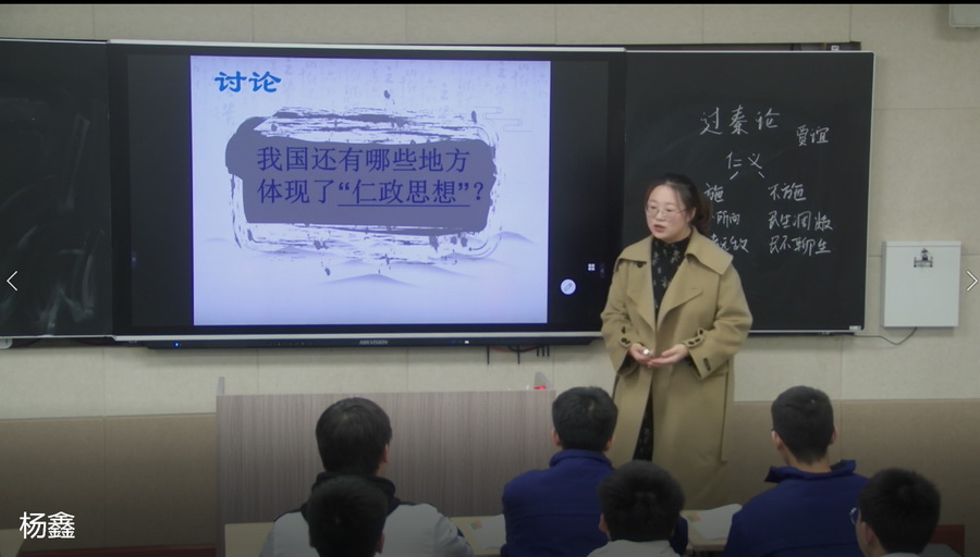 三号赛手,语文组老师杨鑫和高2023届2班同学们进行了一场开卷有益的《过秦论》。杨老师从彝族新年文化的引入自然过渡到本课教学,在温故、知新、朗诵、小结、训练中,引导学生理解何为“仁义”以及怎样“施仁义”,在对比中讨论施仁义的价值,增强学生的文化自信。
