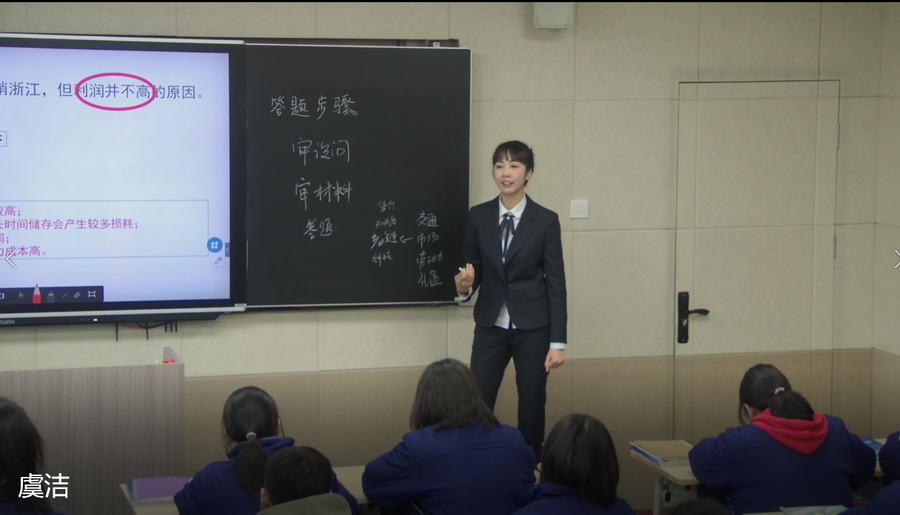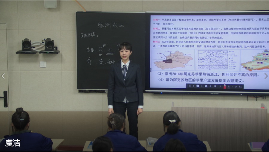 四号赛手,文综组地理老师虞洁与高2023届17班同学们感悟《区域特色农业——绿洲农业》。教师引领学生在绿洲田野里徜徉,通过独学、互学、群学、互评、互问,对新疆阿克苏苹果特色的追因溯果,形成结构化知识建构,并能迁移到其他区域特色农业的学习。