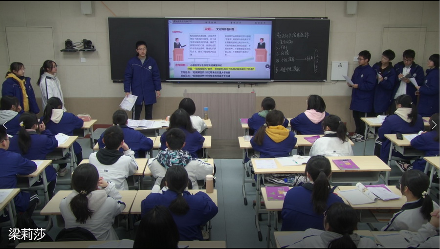五号赛手,文综组政治老师梁莉莎与高2023届20班孩子们一起《在文化生活中选择》的大论坛里尽兴的大辩论。在总议题《风口论剑短视频,奏响文化主旋律》引导下,正方与反方唇枪舌战,文化博弈看利弊→时代泛舟寻原因→文化激荡奏主流,高潮迭起,充分培养学生学科素养。