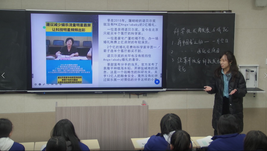 九号赛手,文综组历史老师吴娇同2023届4班孩子们共同讴歌了我国《科学技术的发展与成就》。神舟十三号载人飞船激动人心的视频开启了孩子们“追星”之旅。课前自主探究、课中小组讨论、知识细微点拨、构建思维导图,孩子们认识到时代在召唤,正青春、担责任!