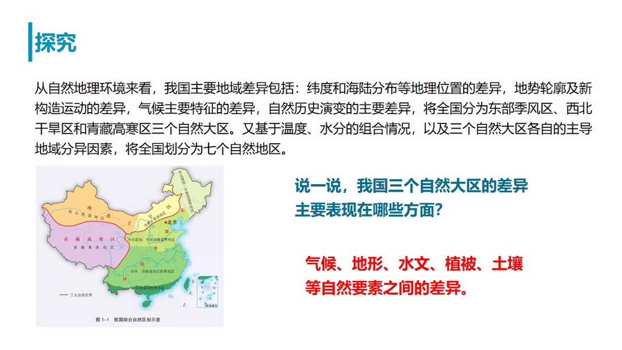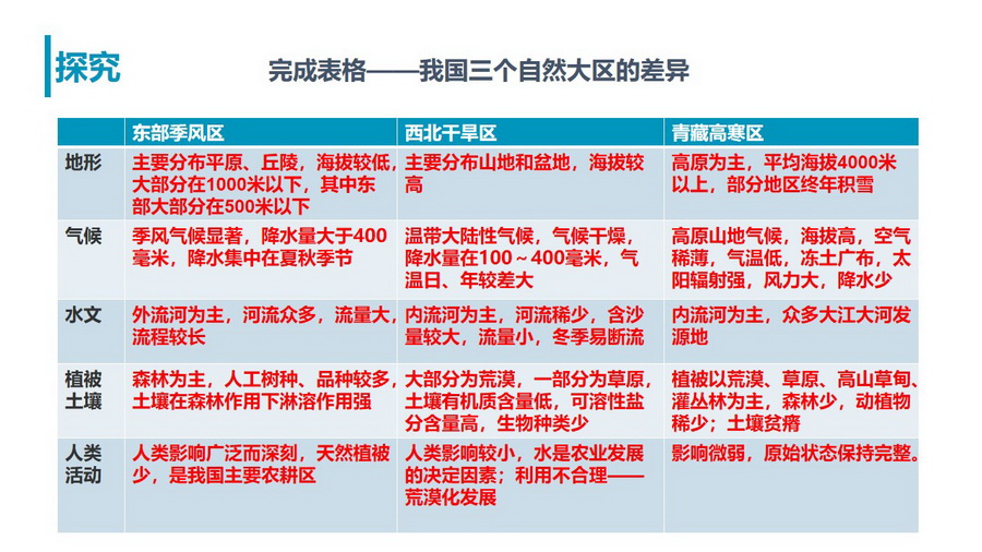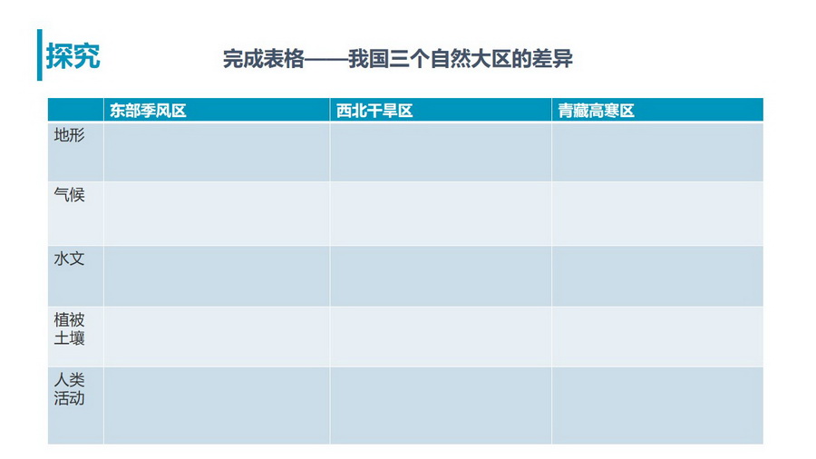 探究:说一说,我国三个自然大区的差异主要表现在哪些方面?要求学生以表格的形式完成三个自然大区差异的比较。培养学生的区域认知能力。