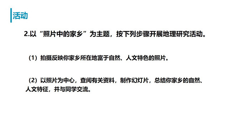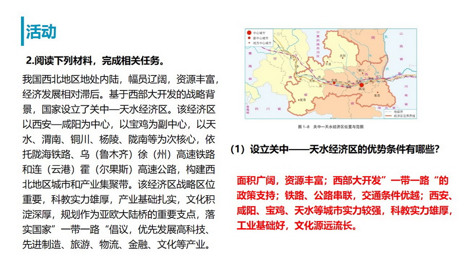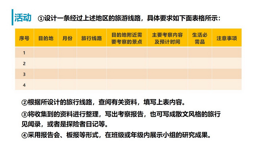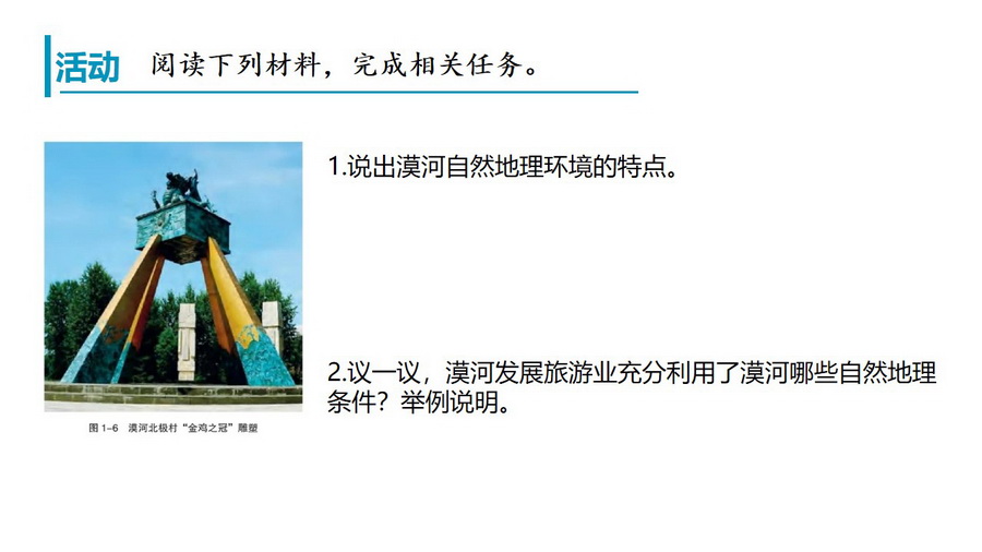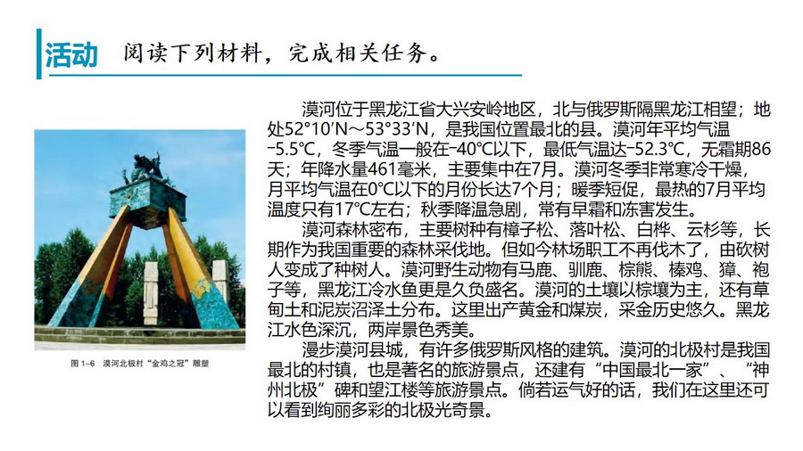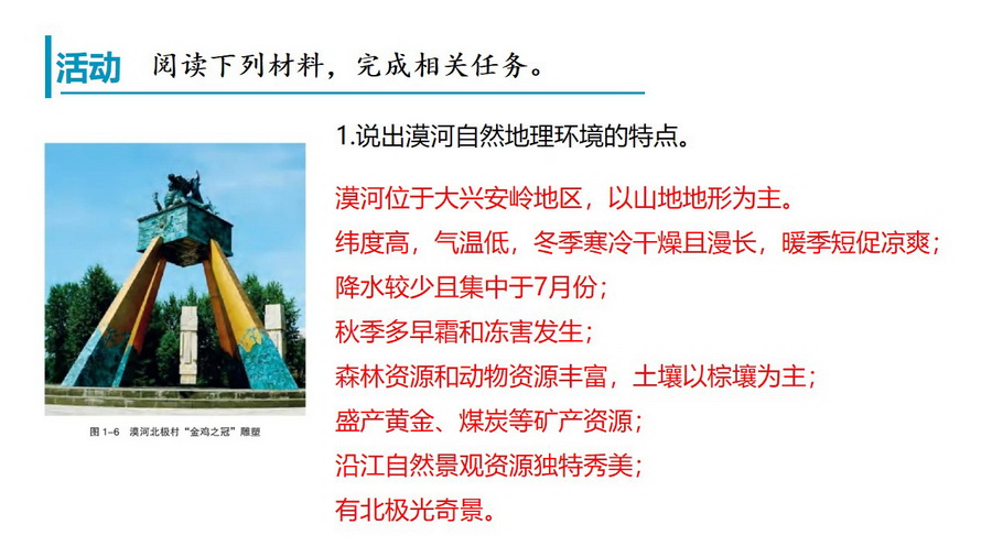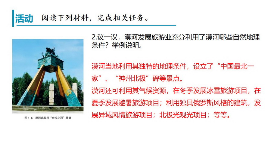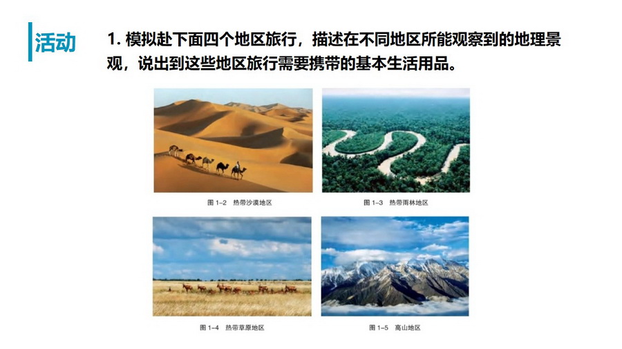 教材活动:认识自然地理环境特点及探讨如何因地制宜发展人类活动。