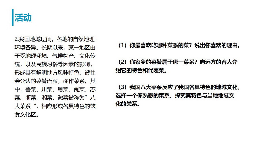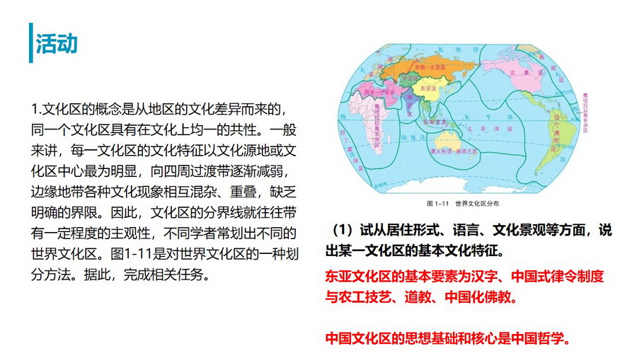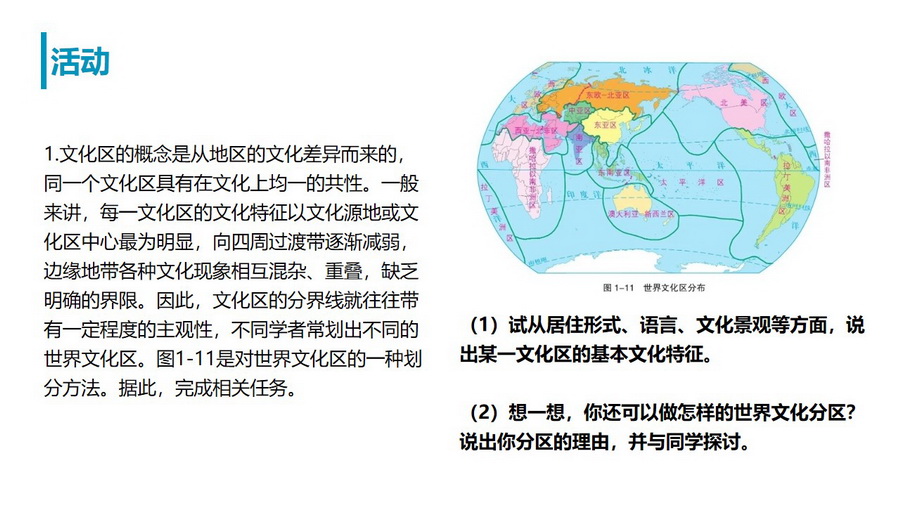 教材活动:了解世界文化分区域及中国饮食文化区域,加深对文化区的理解。