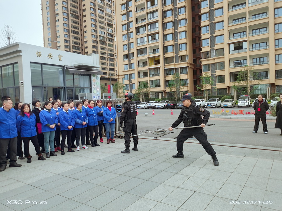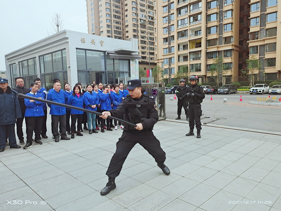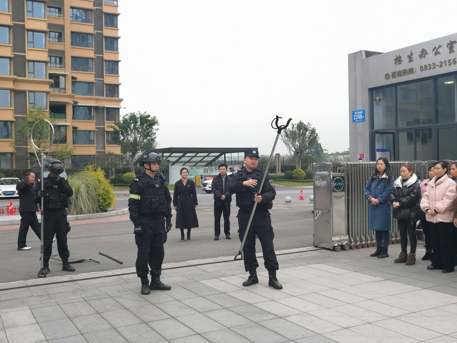 王伟历教官就近期校园安全形势向培训人员做了说明,要求学校教职工及安保人员必须知道正确使用反恐器械,在思想上和行动上重视起来。他就如何识别异常人员、遇到突发事件时的自身安全防护、处置流程进行了培训,对法式防暴盾牌、钢叉、甩棍等警用器械的使用进行现场示范,并着重强调了一键式报警装置使用的重要性。