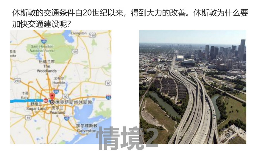 设置情境2,休斯敦的交通条件自20世纪以来,得到大力的改善。休斯敦为什么要加快交通建设呢?激发学生的探究欲望。P25——P26