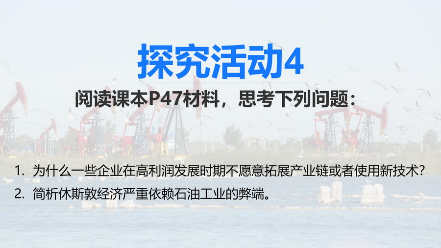设计意图:引导学生深入体会拓展产业链和创新技术对产业发展的重要意义以及休斯敦严重依赖石油工业的弊端。
