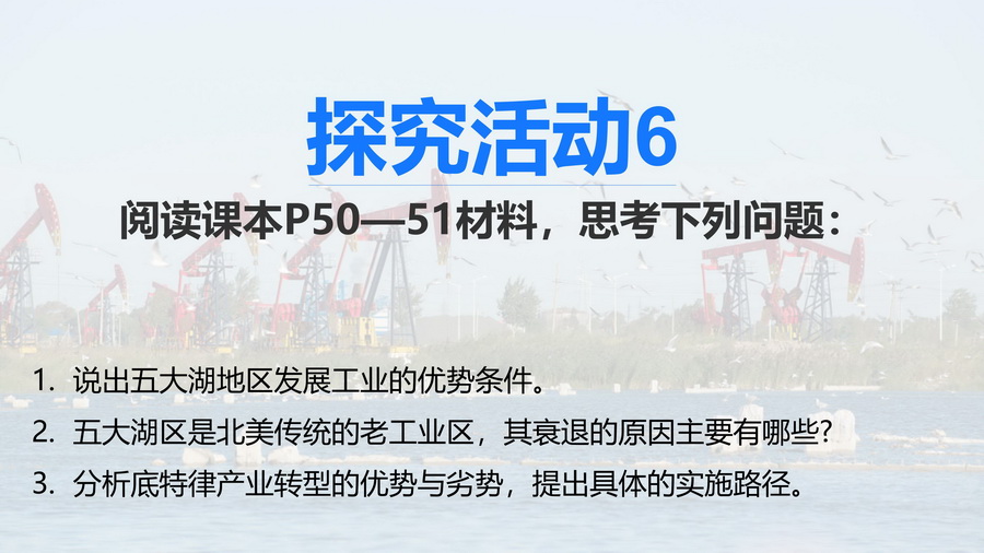 设计意图:该活动选择的区域为北美历史最悠久的传统工业区——五大湖区, 图文结合介绍了当地概况及产业发展历程,引导学生从区域比较的视角看待不同类型地区的产业转型,从而更好地思考区域转型发展问题,体会区域的可持续发展之路。