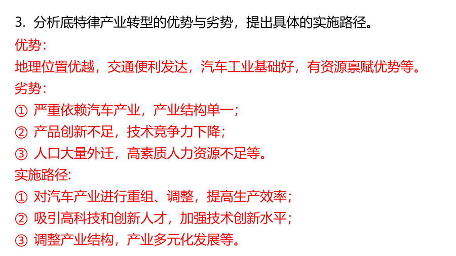 3.分析底特律产业转型的优势与劣势,提出具体的实施路径。
