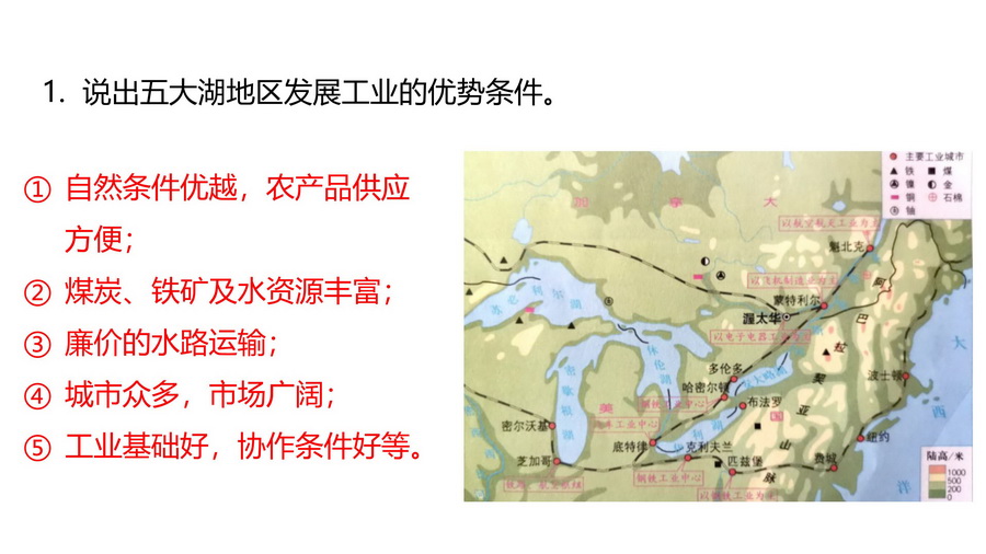 1.说出五大湖地区发展工业的优势条件。