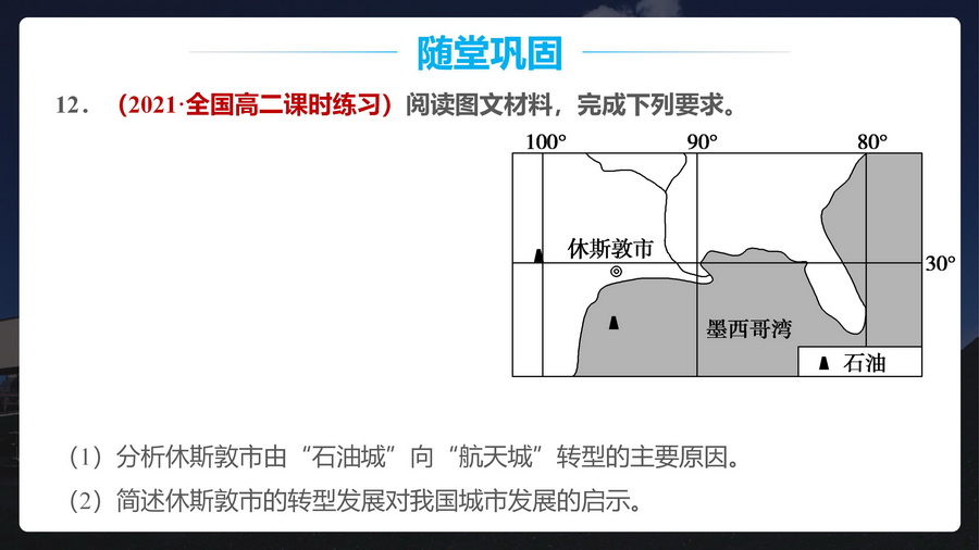 设计意图:引导学生归纳整理休斯敦产业转型的优势条件,深刻理解其产业结构优化历程和实施措施,这对资源枯竭型地区的转型具有启示意义。