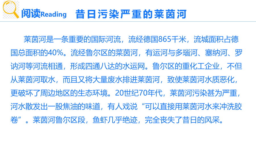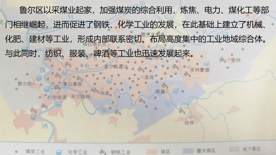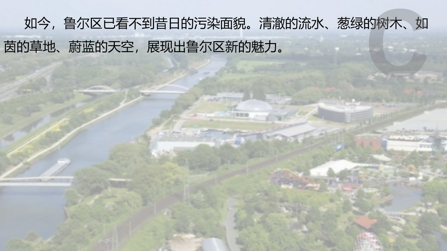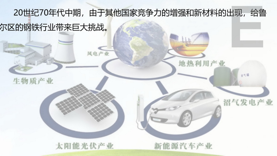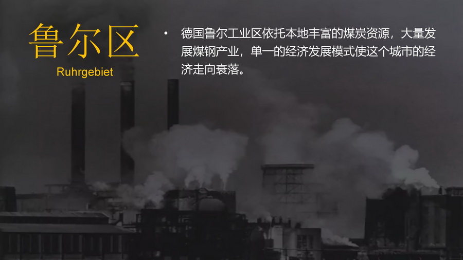 展现鲁尔区繁荣背后造成的严重环境污染。因而,严重依赖某种资源发展相对单一的产业,对于一个地区是不可持续的。这样为鲁尔区的可持续发展打下铺垫。