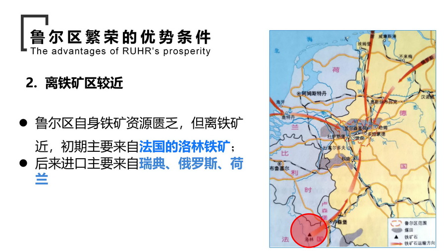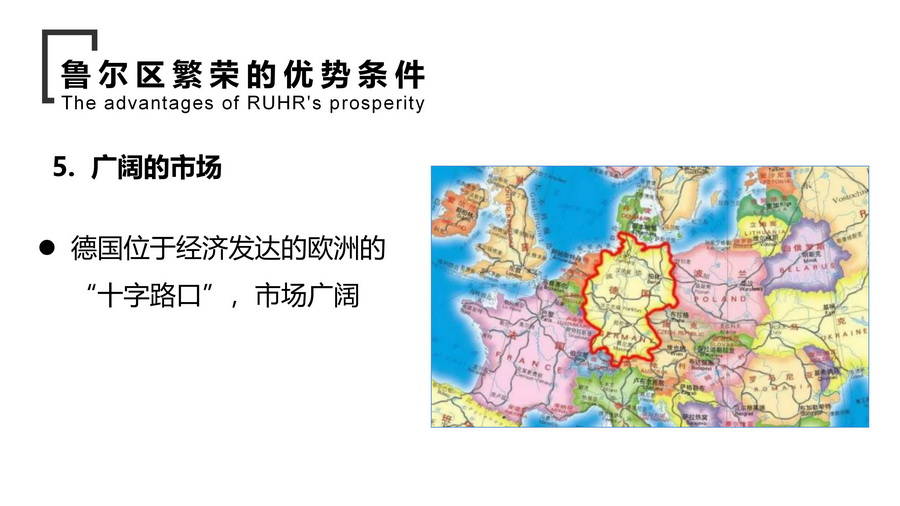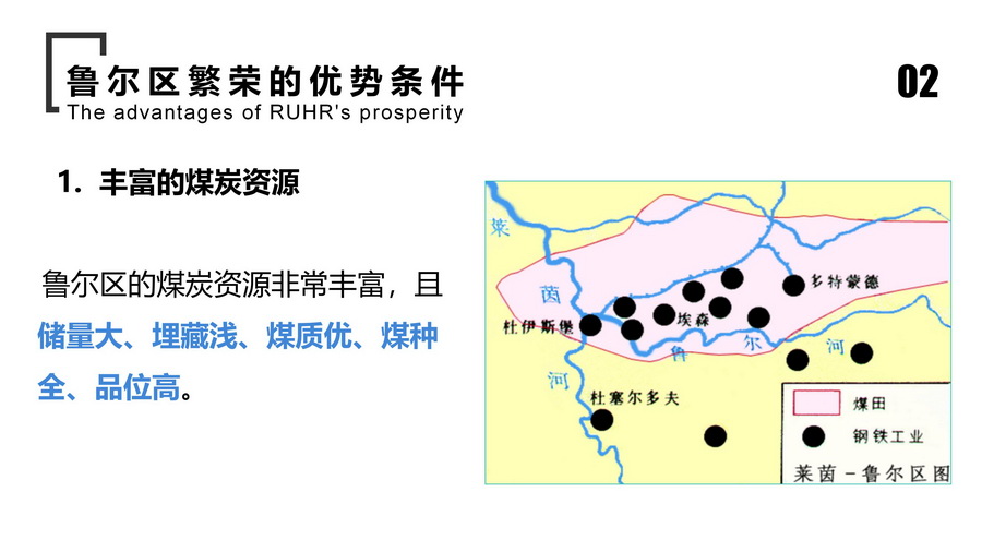 鲁尔区繁荣的每一个区位优势都是以图片的形式展示出来,通过图片获取信息,找出鲁尔区的优势条件。