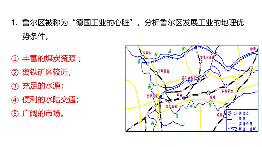 探究活动2:鲁尔区被称为“德国工业的心脏”,分析鲁尔区发展工业的地理优势条件。
