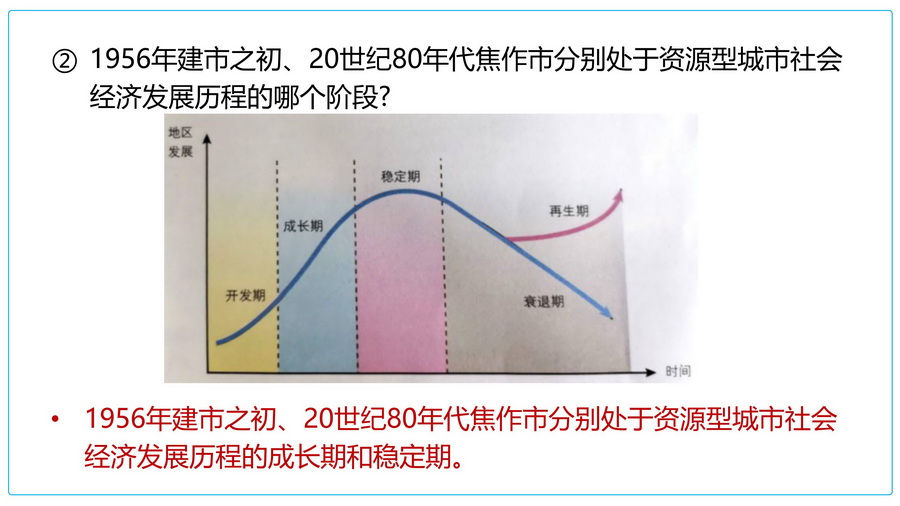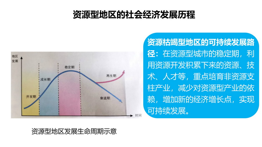 设计意图:从理论高度认识资源型城市的发展历程,重点在于让学生认识到:资源型城市的转型发展必须在当地的自然资源走向衰退之前,未雨绸缪,提前布局,利用城市经济发展稳定期积累的资源、技术、人才等,带动其他产业和第三产业的发展,重点培育非资源型支柱产业,增加新的经济增长点,才能获得经济的可持续发展。