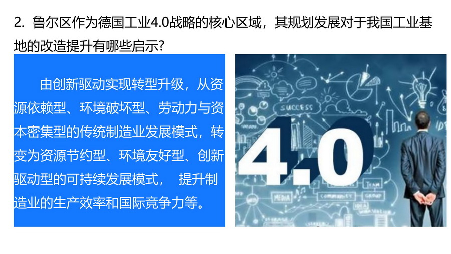 设计意图:鲁尔区的转型发展之路仍然在持续深人,了解德国工业4. 0战略计划提出的背景,以及在工业4. 0计划框架下鲁尔区规划发展的重点产业部门。