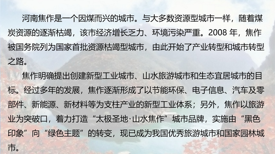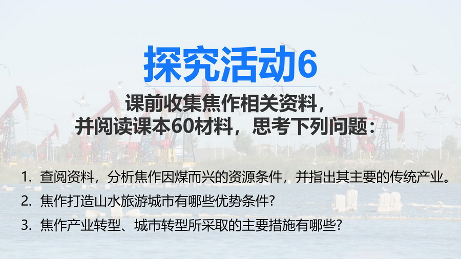 课前收集焦作相关资料,并阅读课本P60材料,思考焦作作为煤都的发展背景及整治措施。
