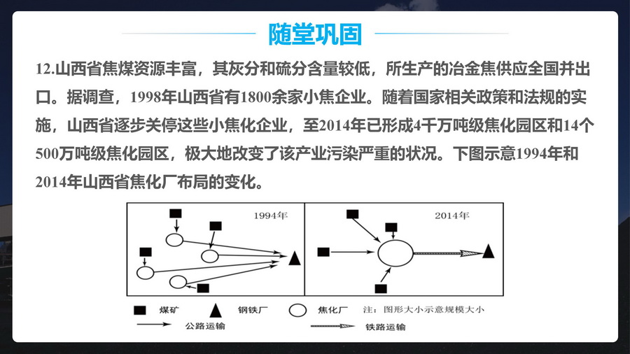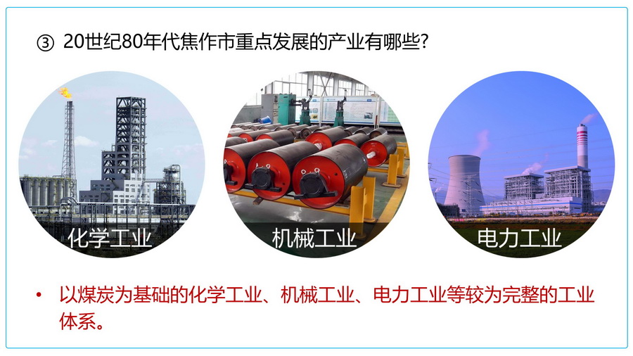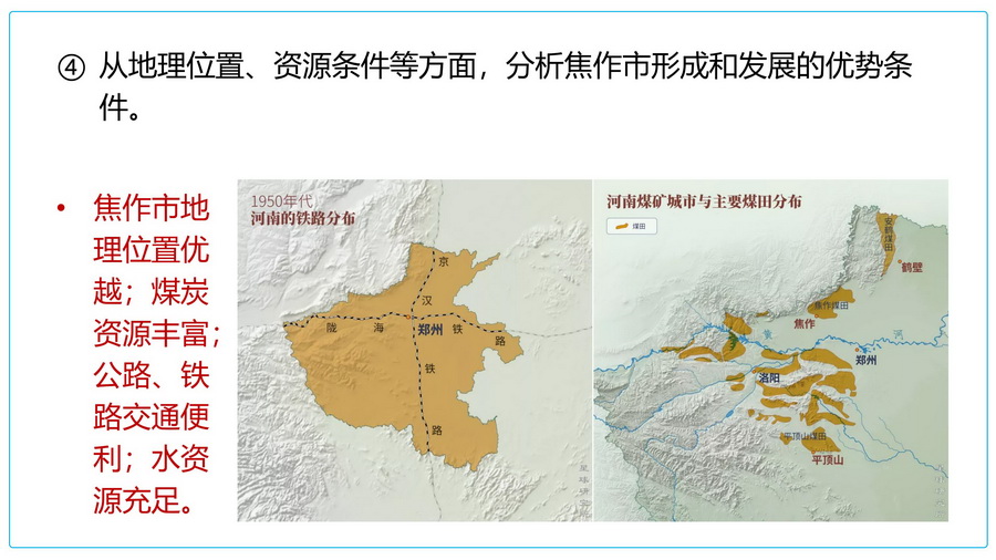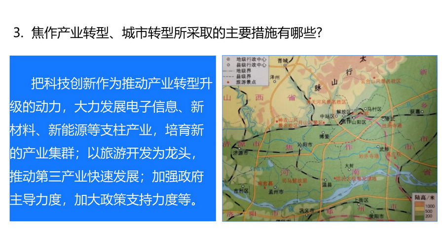 设计意图:了解我国首批12个资源枯竭型城市之一河南焦作的发展历程,分析焦作在不同时期的产业发展方向和优势条件及整治措施。通过鲁尔区的学习来探讨焦作,培养学生学以致用的能力。