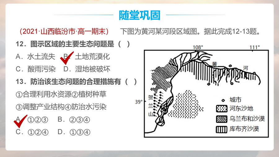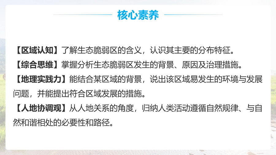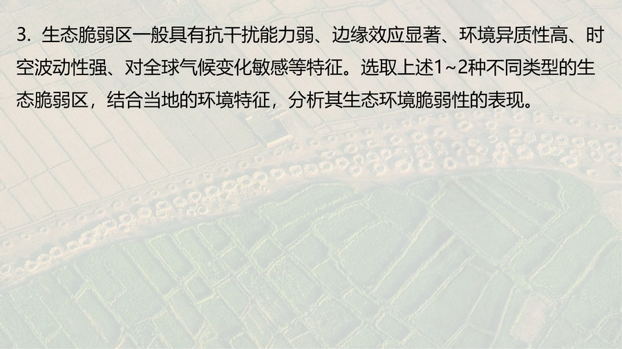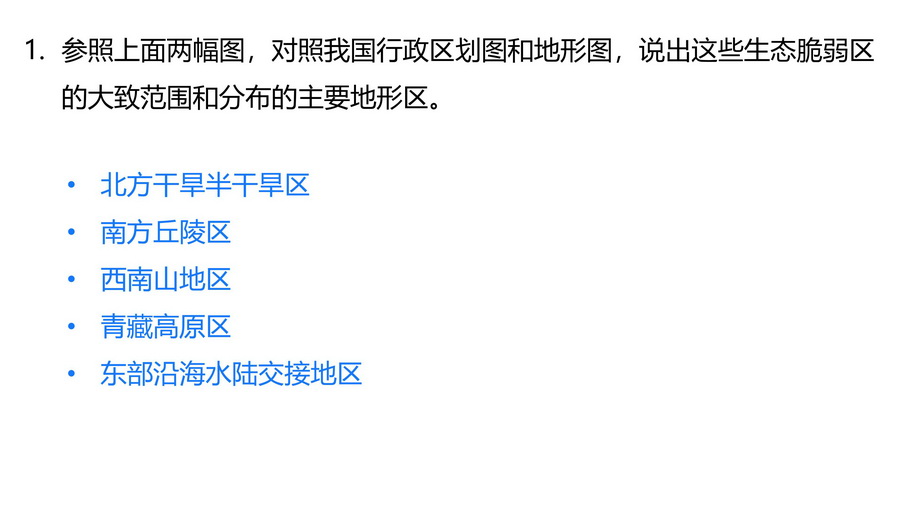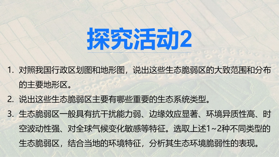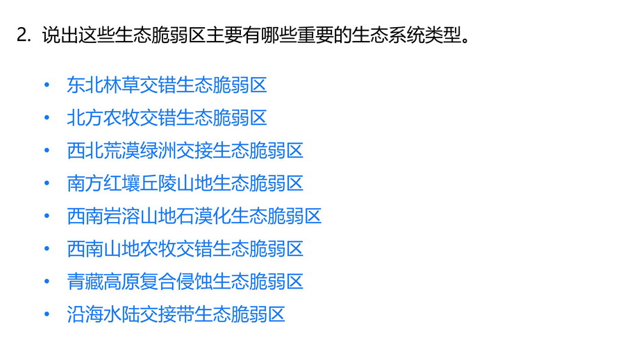 1.以“中国生态环境脆弱区空间分布图”,思考如何定义生态脆弱区、产生的背景以及如何恢复和利用。