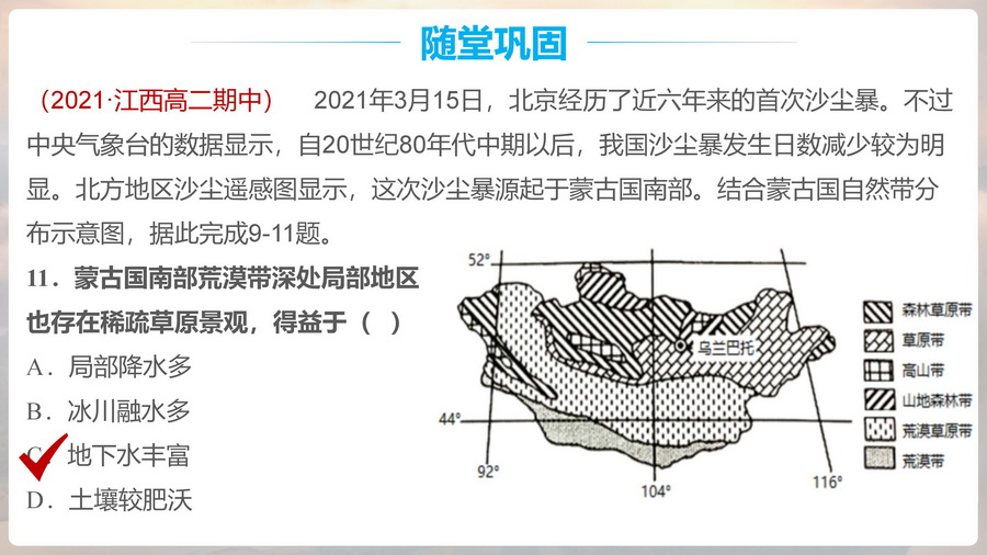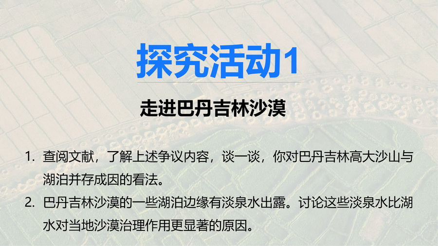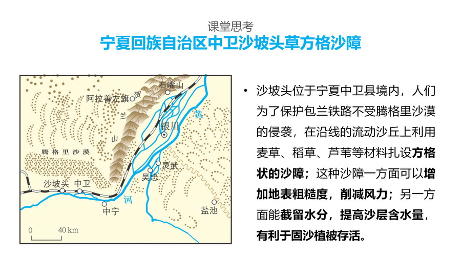 设计意图:通过对该情境的思考和分析,认识淡水资源对治理荒漠化具有重要意义。