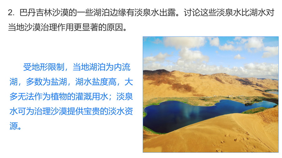 2. 巴丹吉林沙漠的一些湖泊边缘有淡泉水出露。讨论这些淡泉水比湖水对当地沙漠治理作用更显著的原因。