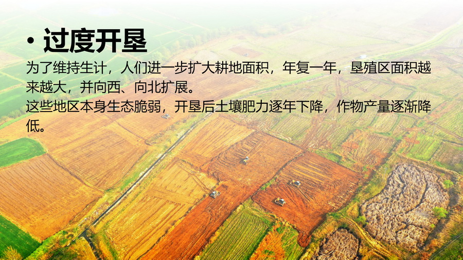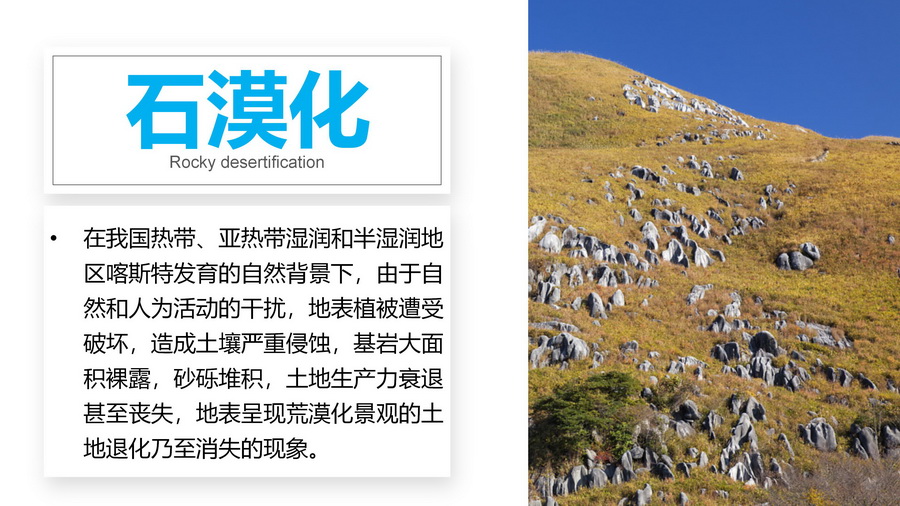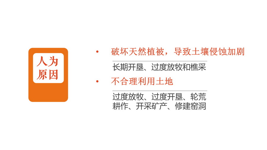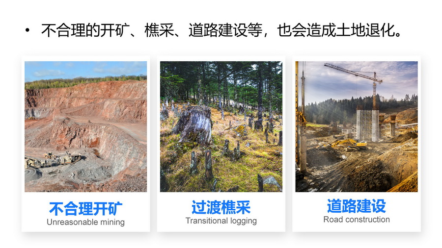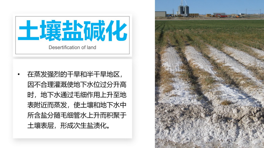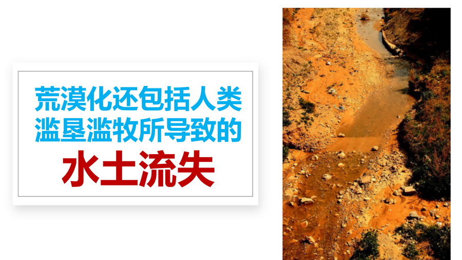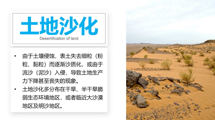 3.分别以图文形式介绍土地沙化、石漠化、土壤侵蚀、土壤盐碱化、土壤肥力下降、水土流水等。