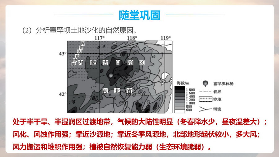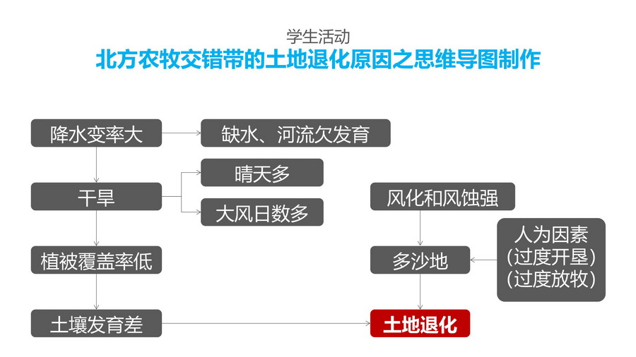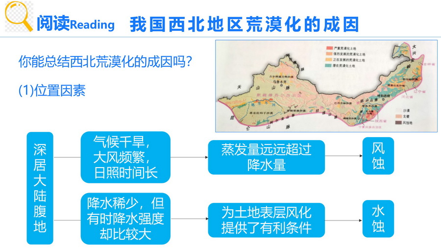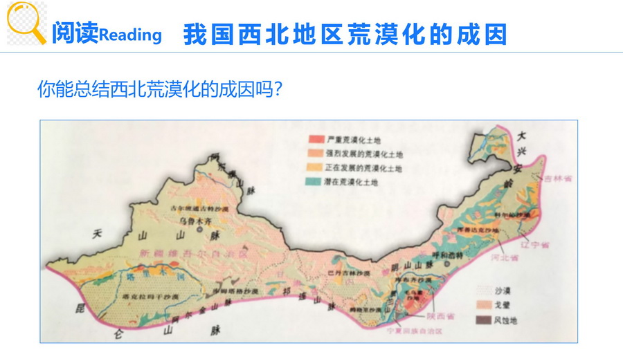 设计意图:西北荒漠化的成因是本节的重点内容之一。分析荒漠化发生的原因。