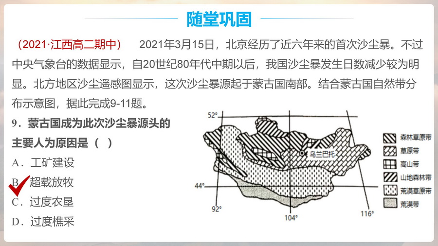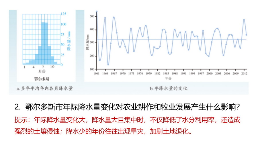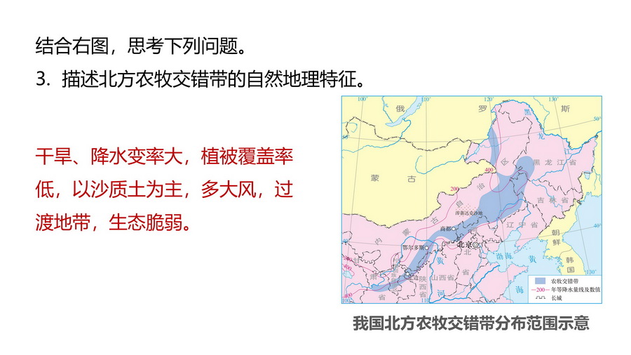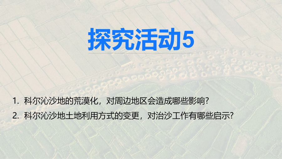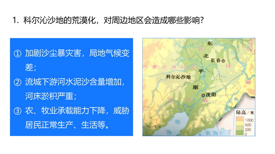 设计意图:从区际联系的视角看待荒漠化的消极影响,思考不同的土地利用方式对荒漠化地区所带来的影响,理解合理的人类活动强度对防治荒漠化的重要意义。