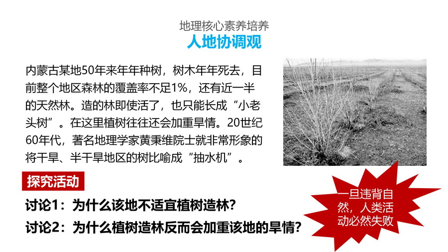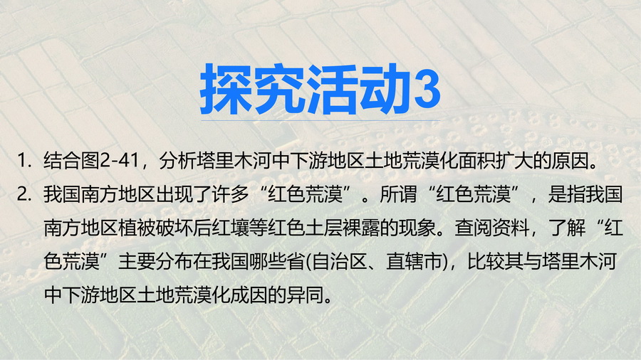 设计意图: 通过对塔里木河中下游胡杨林枯死案例及南方“红色荒漠”案例的对比,从地方尺度以及区域比较的视角,铺垫荒漠化生态脆弱区面临的环境和发展问题,为培养学生人地协调观起到很好的铺垫作用。