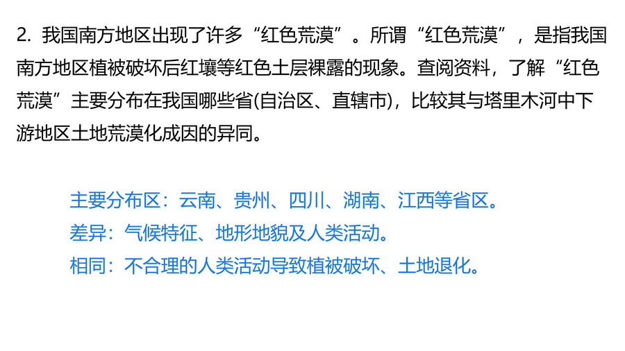 我国南方地区出现了许多“红色荒漠”。所谓“红色荒漠”,是指我国南方地区植被破坏后红壤等红色土层裸露的现象。查阅资料,了解“红色荒漠”主要分布在我国哪些省(自治区、直辖市),比较其与塔里木河中下游地区土地荒漠化成因的异同。