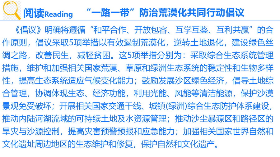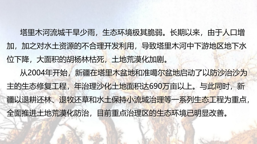 以案例,视频等展示治理荒漠化,我们应遵循尊重自然规律,因地施策。