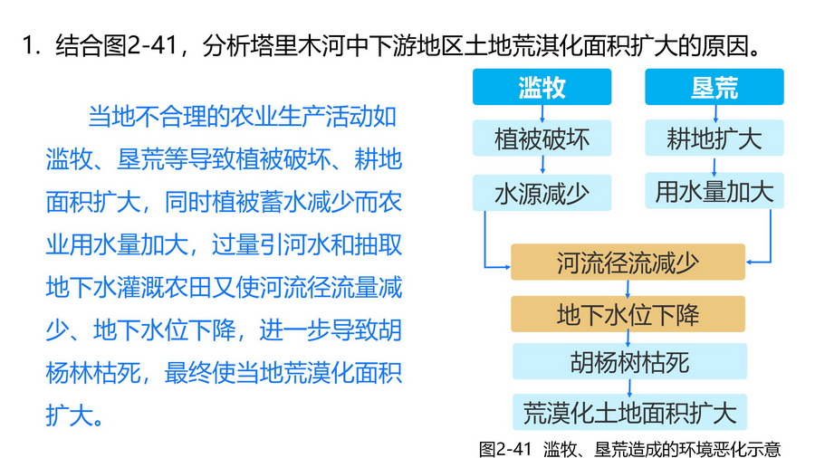结合图2-41,分析塔里木河中下游地区土地荒漠化面积扩大的原因。