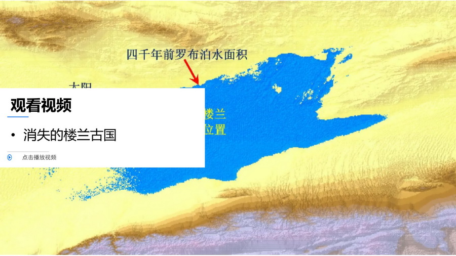 设计意图:楼兰古国的神秘消失,是很多学生感兴趣的话题。通过文字材料、视频、极具历史沧桑感的楼兰古城遗址,带来视觉冲击和无限思考,同时为学生在课后联系历史知识进行学科融合提供了契机。