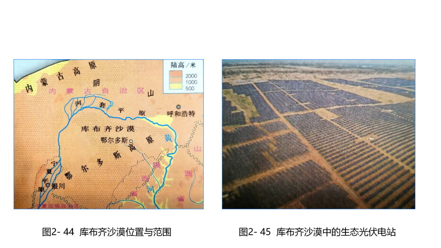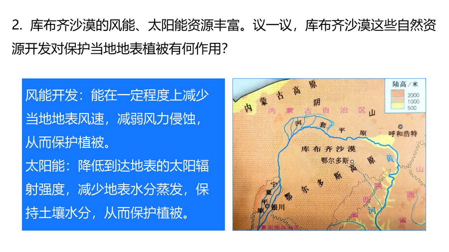 库布齐沙漠的风能、太阳能资源丰富。议一议,库布齐沙漠这些自然资源开发对保护当地地表植被有何作用?
