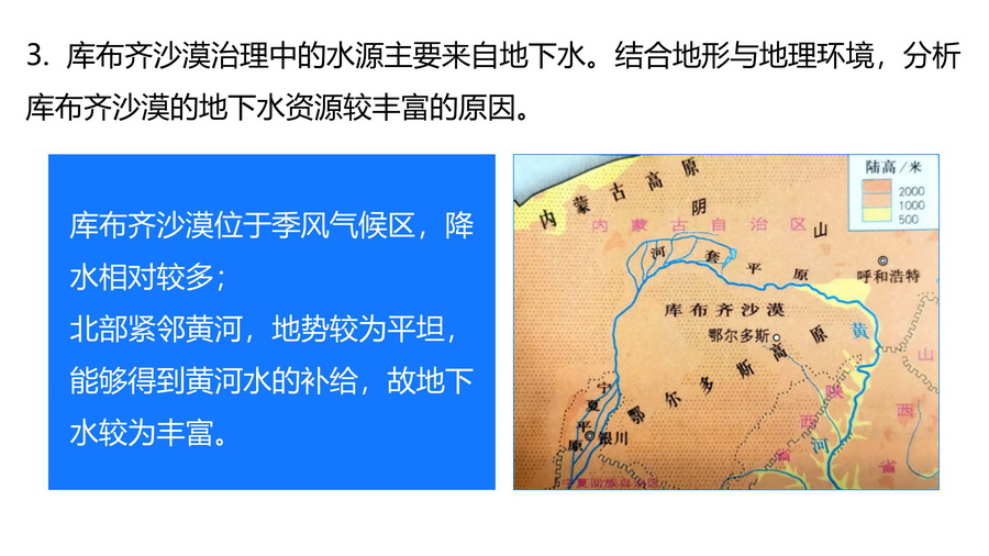 库布齐沙漠治理中的水源主要来自地下水。结合地形与地理环境,分析库布齐沙漠地下水资源较丰富的原因。