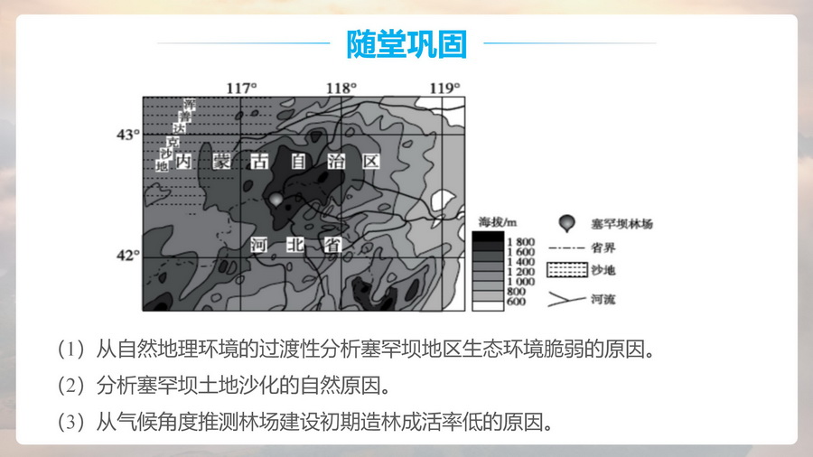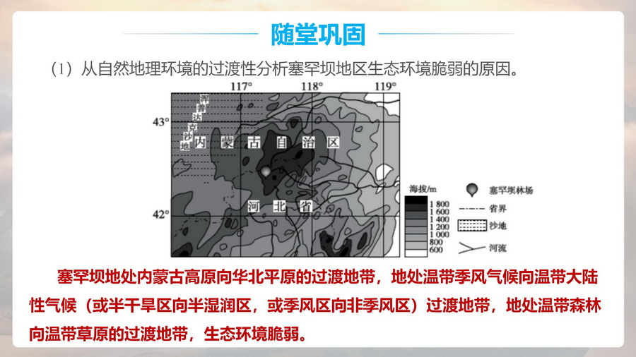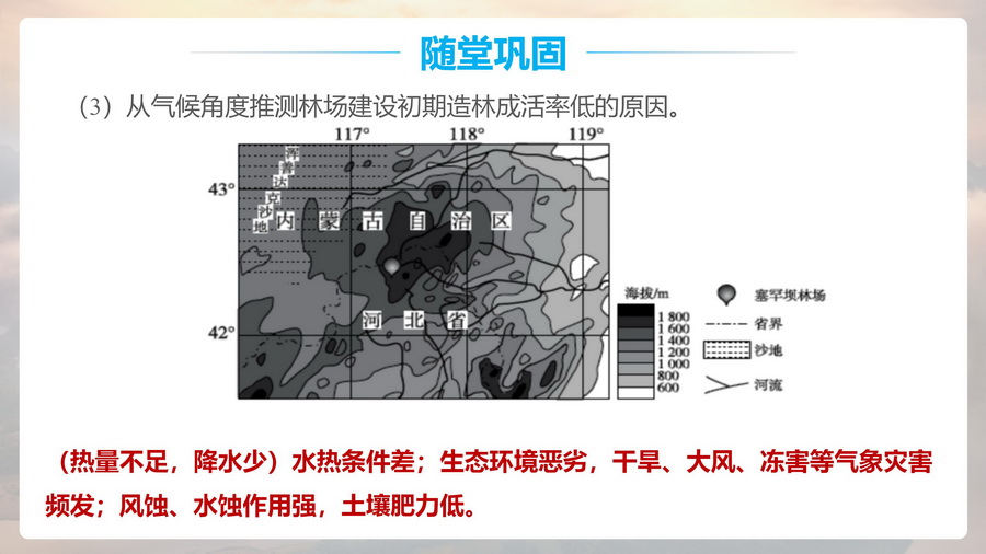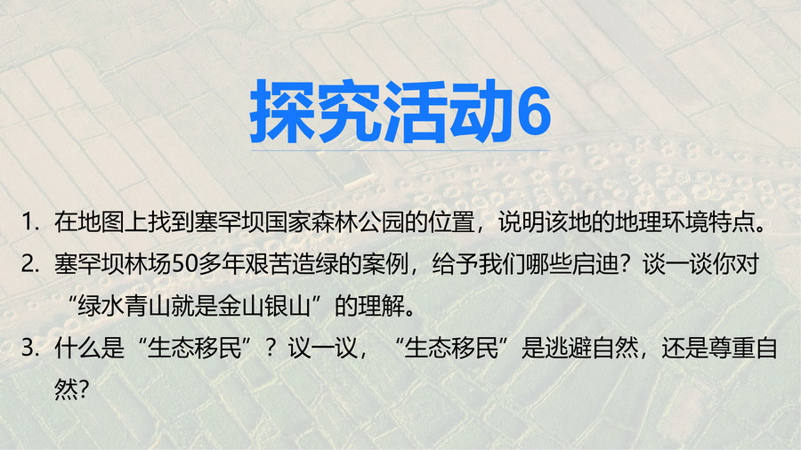 设计意图:通过塞罕坝林场工人经过几代人的艰苦创业,对当地成功治理并获得极好的经济效益和社会效益,深刻理解“绿水青山就是金山银山”的重要意义,渗透人地协调观。